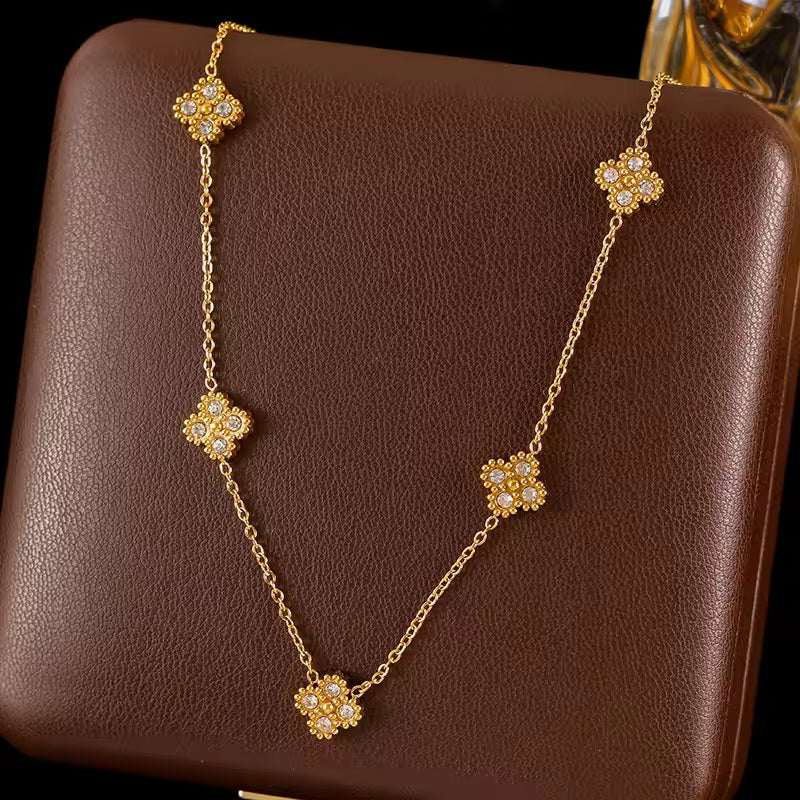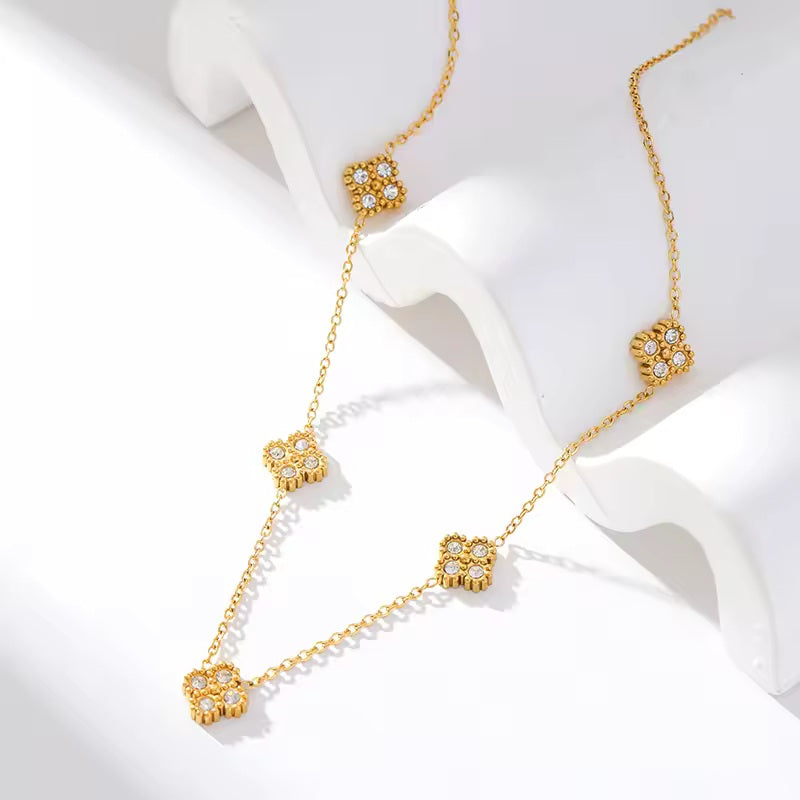 El collar VANIA presenta un diseño con un colgante en forma de flor de trébol adornado con circones brillantes.